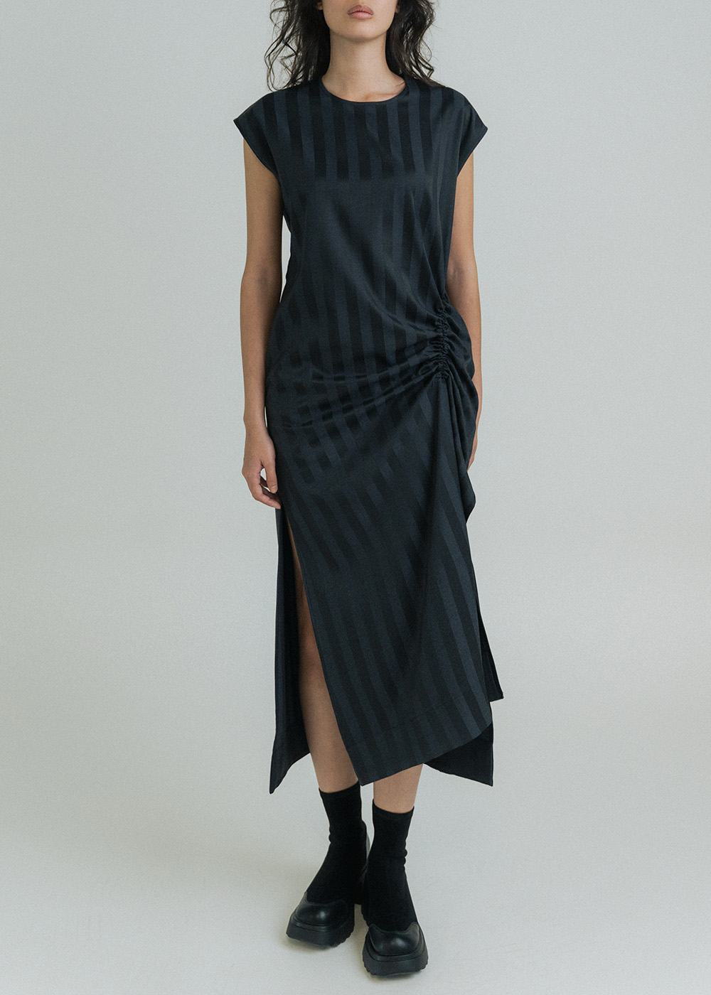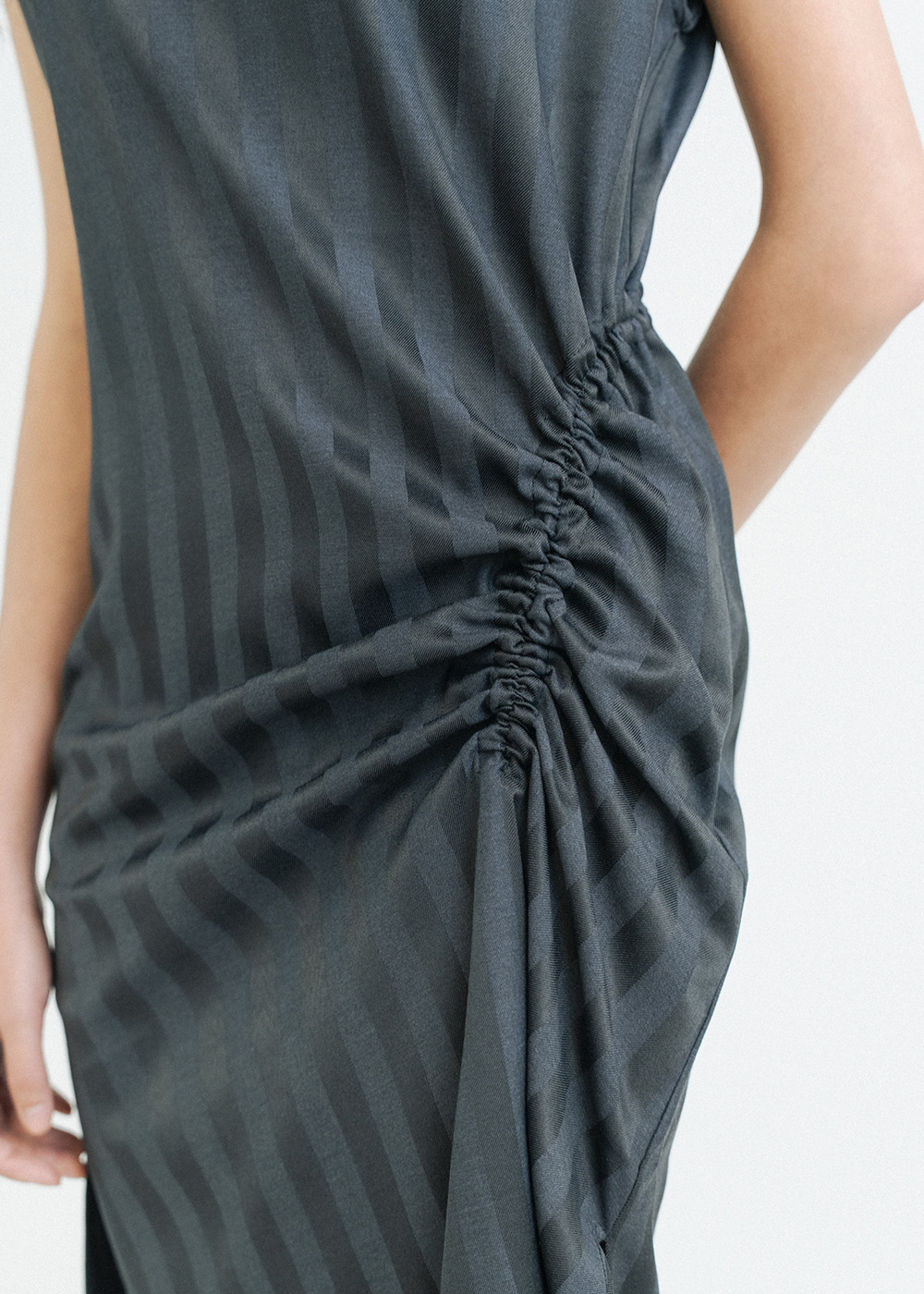 Asymmetric gathered detail at the side waist for shaping